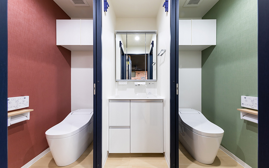 二重ガラスのパーテーションで開放感と防音性を両立しています。