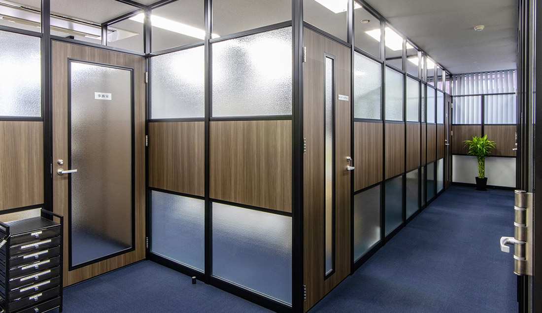 3つの事務所を1ヶ所にまとめる集約移転を承りました。許認可の兼ね合いで限られた施工期間でしたが、初回の見積作成から約一カ月で完工した案件となります。エントランスは白い石張りの造作壁を全面に設置しており、重工感を感じられる空間に仕上がりました。室内の間仕切りには木目調のパネルと擦りガラスを組み込んだアルミパーテーションを採用しており、秘匿性を高めつつも、圧迫感を感じさせない造りとなっております。また、人材紹介事業を運営されているとのことで、来訪した求職者のプライバシーを確保しつつ、安心して相談してもらえるよう設計いたしました。
