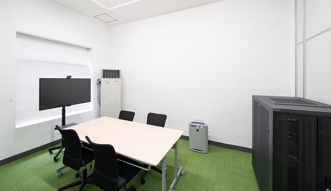 お部屋の用途に合わせ、デザインの異なる施工型のパーテーションを使って明確に区分けしました。会議室はホワイトとアクリルの構成で、透明性の高いスペースを構築。エントランスと執務室の仕切りは上部のみ開口にし、開放性のあるエントランススペースを構築しました。またパーテーション工事に伴い、情報セキュリティの確保のための電子錠を導入しております。床材は各部屋のテイストに合わせ、異なる種類のタイルカーペットと配線類を収納したOAフロアを使用。映像制作などを行われる企業様ということで電気工事を入れ、全体的に明るい空間に仕上げました。