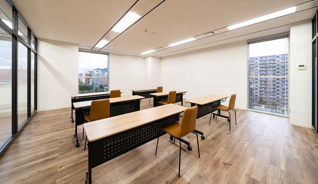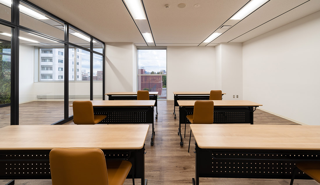 木目調の床材にデスクを並べ温かみのある雰囲気に