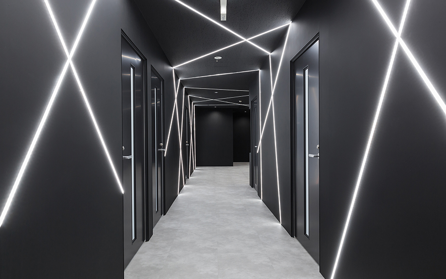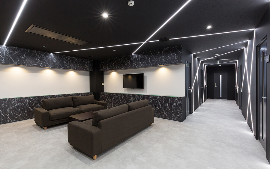 ゲーミング大会サイトの運営やコンテンツ編成配信を事業にする株式会社JCG様。オフィス兼撮影スタジオを斬新なデザインでとご依頼をお受けしました。エントランスデザインとして、“近未来観”や“異次元的”をイメージした空間をご提案。壁から天井まで、間接照明をライン状で幾何学的に施しました。壁紙は黒をベースにすることで、エントランスから光が印象的になるよう設計しています。用途や目的に合わせ、各特徴を持った4つのスタジオをご用意。リフレッシュスペースでは、実際にゲームのテストプレイやデモプレイができるようモニターを取り付けています。従業員の製作活動やクリエイティブの質に繋がるよう、格好良さと働きやすさを高めた空間に仕上げました。