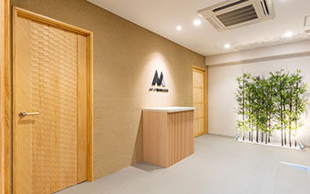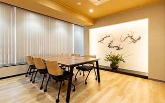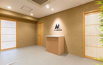 海外オフィスでも注目されている「和モダンをテーマに設計して欲しい。」とのご要望を承りました。そこで、エントランスには日本家屋で用いられている格子戸風の引き戸と淡路土を用いた左官での土壁を採用しており、カウンターに取り付けたリブ材との質感のコントラストが空間に表情を与えてくれます。また、テーマに合わせた建具や仕上げ材を選定し、竹林を配置する事によって和の雰囲気を一層感じられる空間に仕上げております。その他には応接室と会議室に水墨画のデザインが施されたクロスを貼り施工し、間接照明との調和を取る事で、高級感の演出とテーマとの整合性も図っております。最後に執務室に関しては隣接エリアとのバランスを考慮し、木目調の什器で統一。自然素材を用いる事で、和を感じられる落ち着いた雰囲気に仕上がりました。