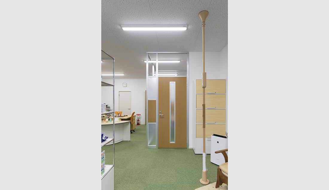 介護商品の取り扱いや、介護サービスのご利用相談を受けるサービスを展開しているため、ご高齢の方に配慮しナチュラルカラーをベースに、床はグリーンのタイルカーペットを使用し優しい空間を作りました。介護サービスのご相談を受けるためスペースを設けており、介護に対する心配事など個別にご相談に応じる空間を作りました。シルバーカー、電動式ベッド、シャワーチェアなど実際に体験して頂けるスペースを確保し、空間はゆったりめにしております。