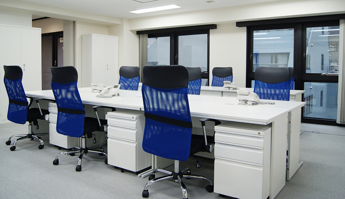 コーポレートカラーの青をアクセントに家具を設置しました。