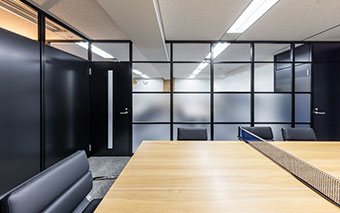 執務室と会議室の間仕切りにはガラスのパーテーションを採用