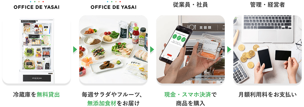 OFFICE DE YASAI(オフィスでやさい)は、オフィスに冷蔵庫や冷凍庫を設置するだけで、サラダ・フルーツ・こだわり惣菜・軽食等、月140種以上の健康的な食事を定期的にオフィスにお届けし、従業員は1個100円〜で食べられる食の福利厚生サービスです。