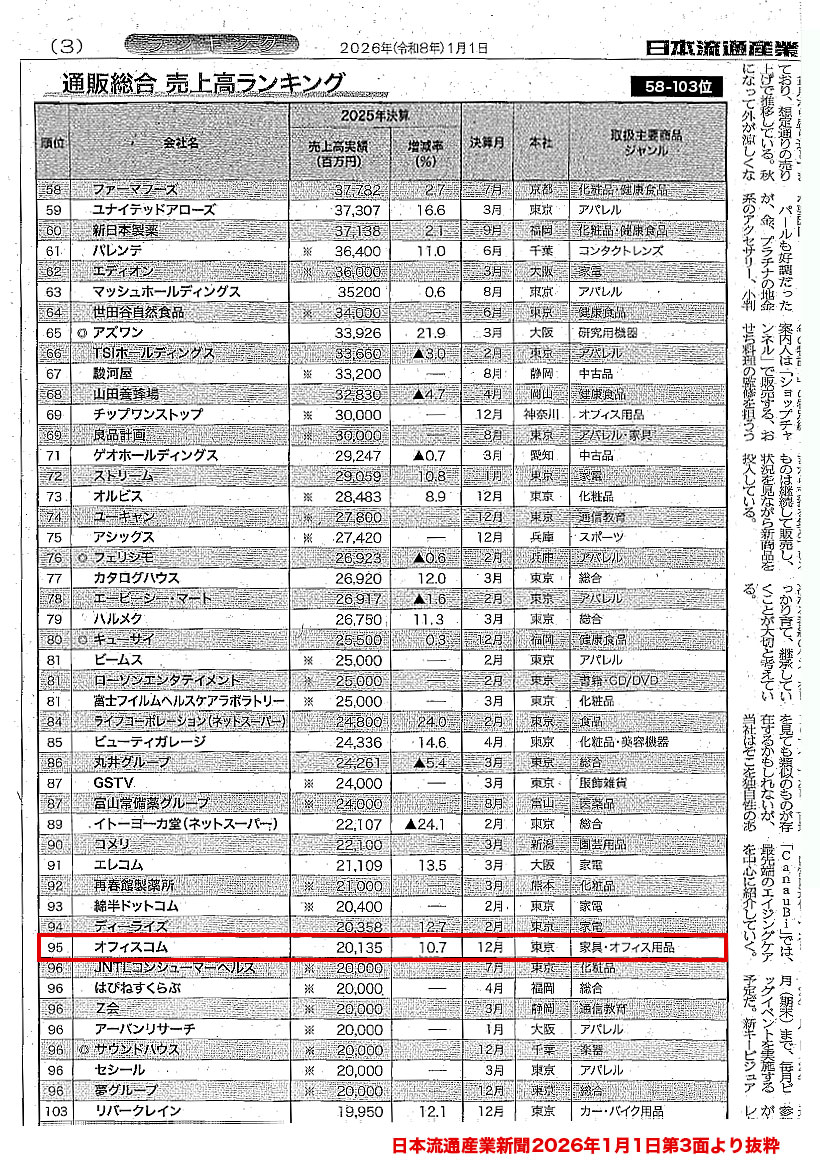 2026年1月1日発行の日本流通産業新聞にて発表された「通販総合売上高ランキング(2025年実績)」において、オフィスコムが第95位にランクインしました。