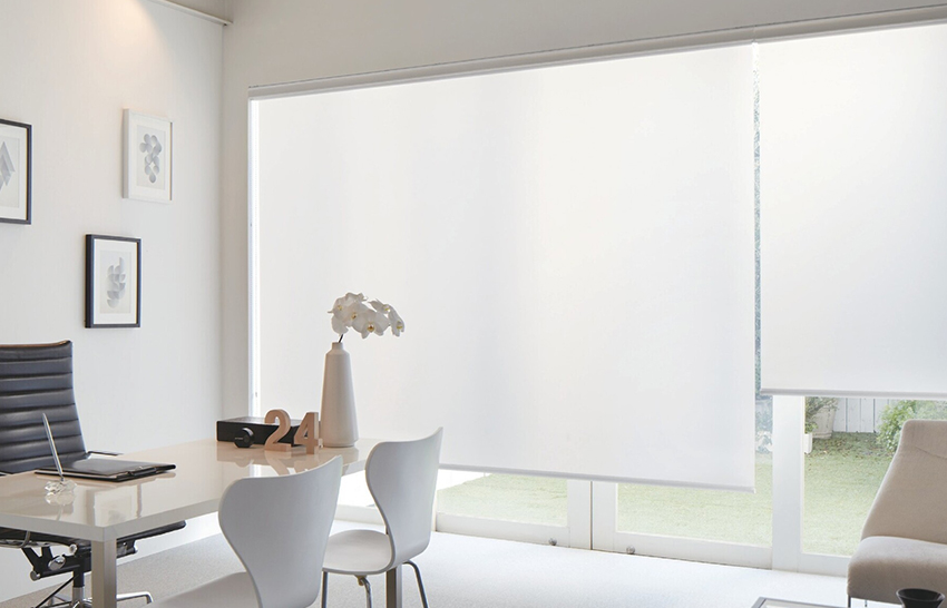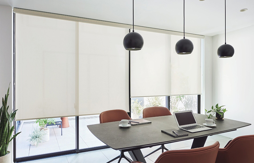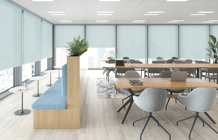 オフィスに最適な、自然光を柔らかく採り入れるロールスクリーン。外の景色が感じられるシースルー生地が、眩しさを抑えつつ明るく開放的な空間を演出。圧迫感のないシンプルなデザインで、快適な執務環境を創ります。