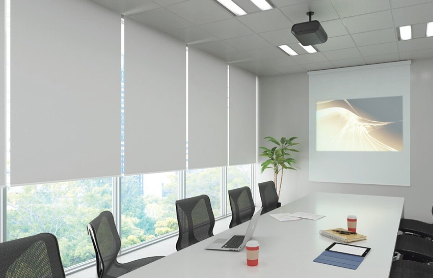 会議室の窓の遮光と、プロジェクタースクリーンとしての活用例。外光をしっかり遮り、室内を最適な明るさに保つことで、プレゼンに集中できる環境を創出。スマートなデザインが機能的なビジネス空間に調和します。