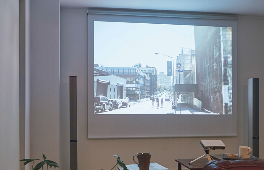窓の目隠しとスクリーンを1台で兼用できるロールスクリーン。映像を鮮明に映す専用生地がリビングをホームシアターに。普段はすっきりと巻き上げて収納でき、専用スクリーン不要で空間を有効活用できるのが魅力です。