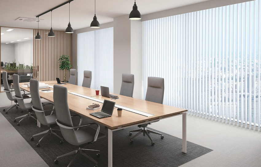 白いタテ型ブラインドが並ぶ窓から明るい光が差し込む会議室。モダンな長机と椅子が配され、集中できる洗練されたビジネス空間です。