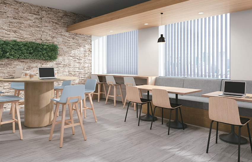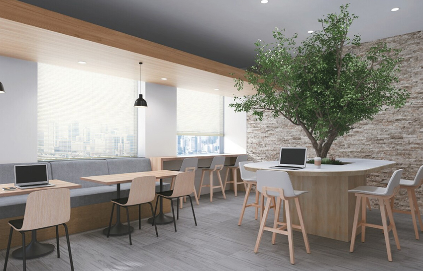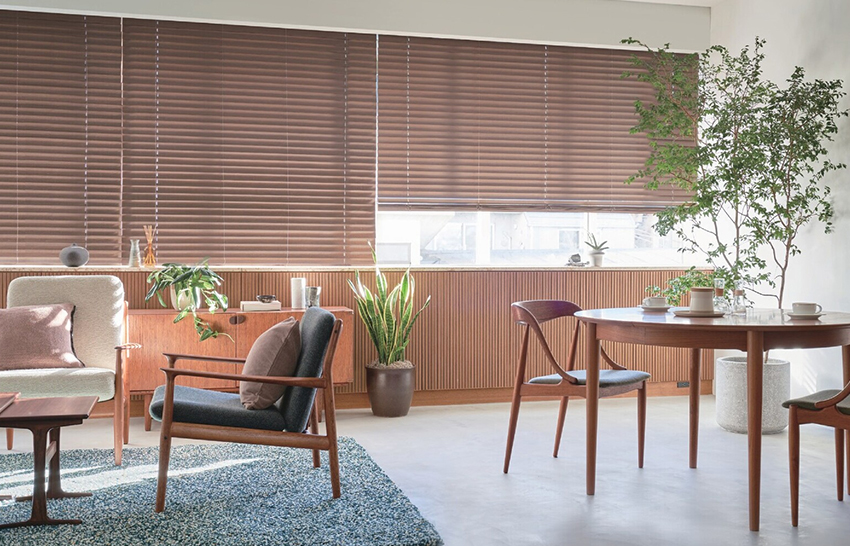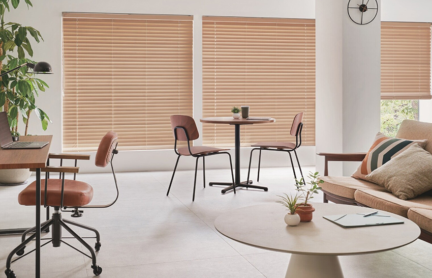 社員がリラックスするラウンジスペースにヨコ型ブラインドを。「アフタービート」シリーズの木目調スラットなら、画像のようなナチュラルな内装にも美しく調和します。繊細なスラットの角度調整により、眩しい日差しは遮りつつ、外の景色を楽しむ快適な光環境を実現。上質なリフレッシュ空間を演出します。