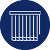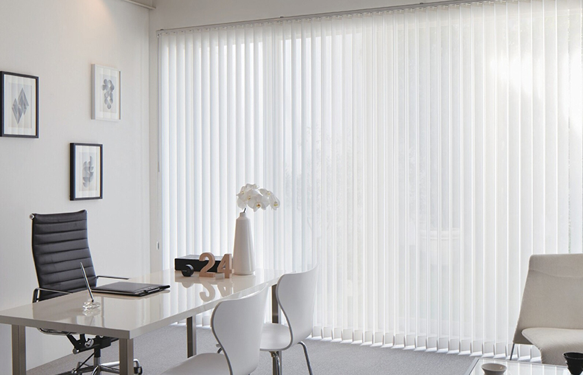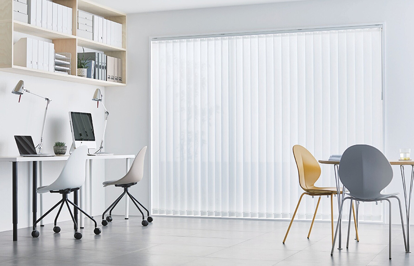 オフィスなどの大きな窓に最適な縦型ブラインド。厚手とレースの生地を組み合わせ、光と視線を自在に調整可能です。プライバシーを守りながら開放感も演出し、シャープで明るい空間を創ります。