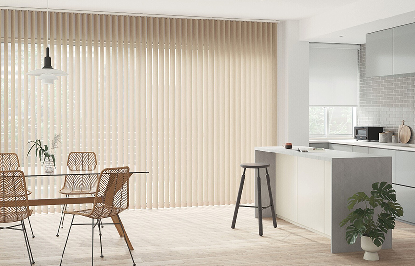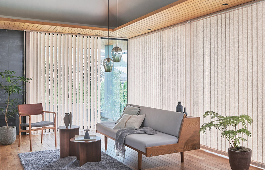 縦スラットの角度調整で光と視線を自在に調節可能。シャープな縦線が天井を高く見せ、部屋全体をすっきりと演出。大きな窓にも映える、スタイリッシュなブラインドです。