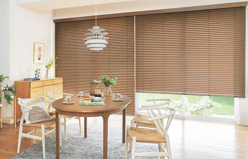 天然木のテーブルにブラインド越しの光が縞模様を描く。デザイン性の高い家具と調和し、創造性を刺激するモダンなワークスペースです。