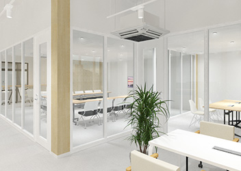 ガラスパーテーションを使い、省スペースでも狭さを感じさせない空間づくり 株式会社貴瞬様